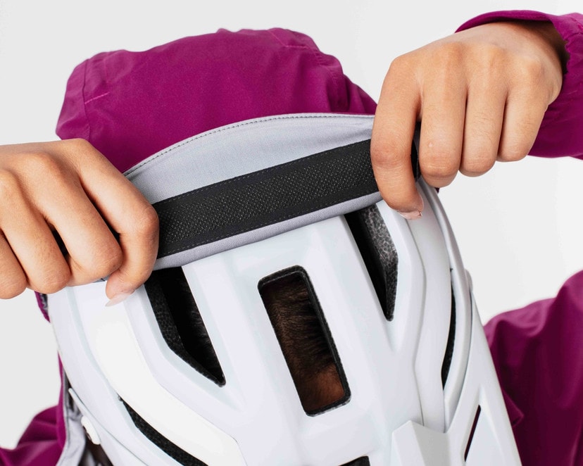 Adjustable weather protection for on and off the bike. A silicone band running along the inside of the hood prevents slipping off the helmet. With a drawcord, the hood can be adjusted to also fit without a helmet.